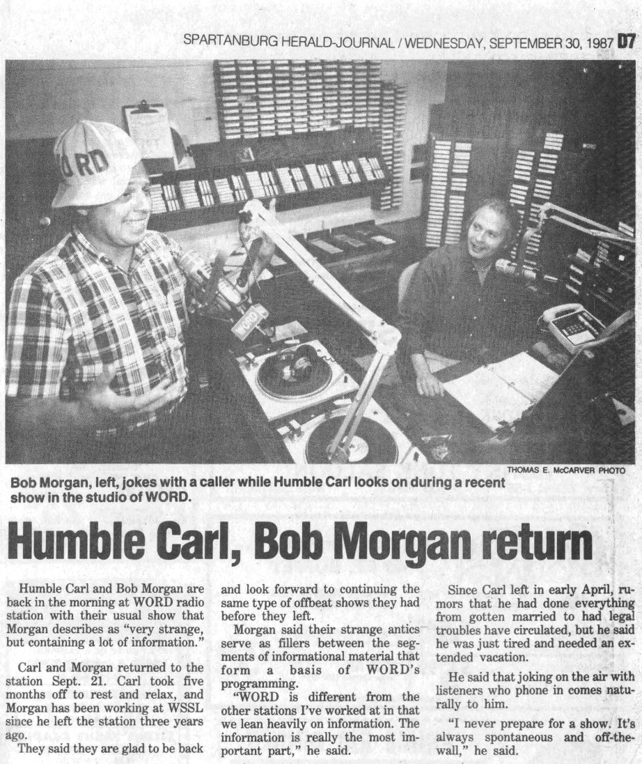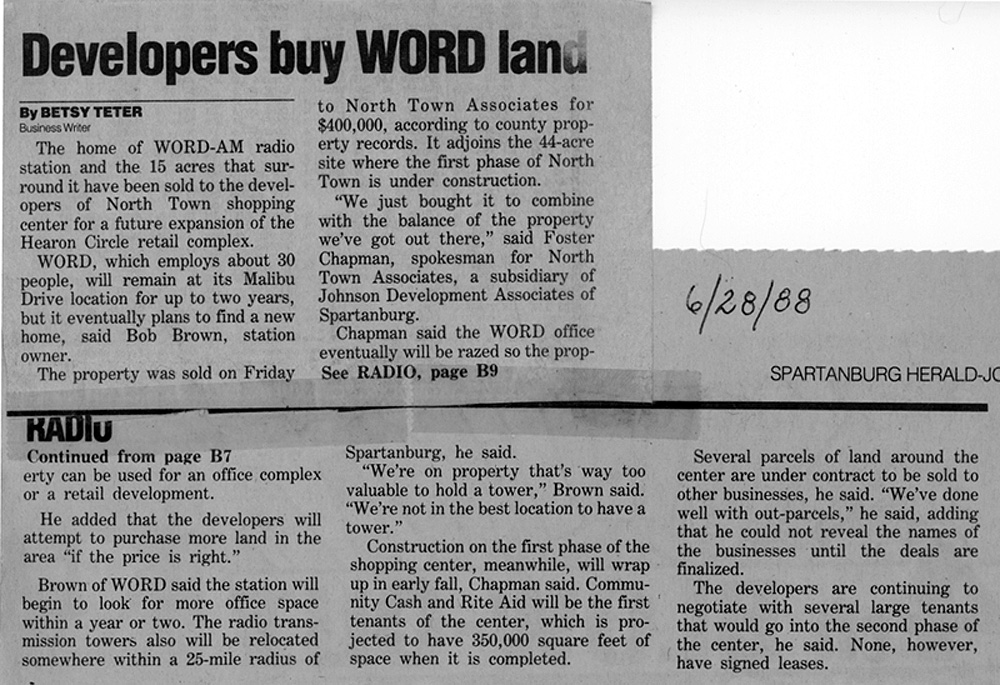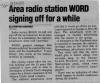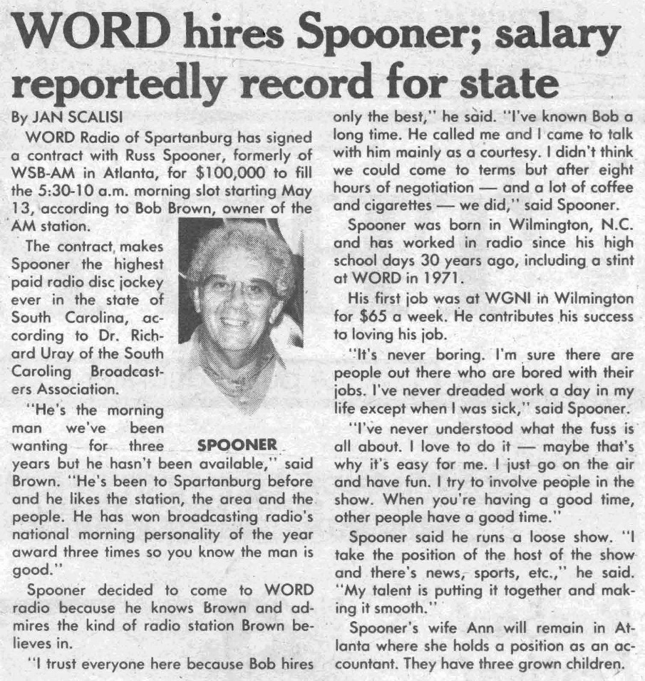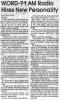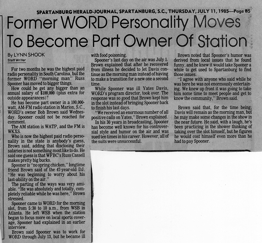 I was going through old papers in the garage this afternoon in the Atlanta 'burbs, looking to see what I could throw away / clean up / etc / et al. You know the drill on such things if you've ever kept way too many things over the years. I ran across an envelope or two of clippings my late mom had apparently cut out of the local Spartanburg, SC newspaper of mostly news items regarding where I worked at the time, WORD radio. All were from the mid and late 1980's. WORD was one of the more well-known medium market "top 40" stations for quite a long period of time, and I was fortunate to have grown up listening to it and subsequently worked there twice. I apparently did ok (smile), winning a market-wide "Who is your favorite dj?" thing one of the upstate newspapers did one year. Kinda floored me, didn't expect it. There are so many newspaper clippings! I'll scan more of these in and post them as I get time or am bored at night. I remember in the naiveness of my teens and twenties I thought I would always work there... it was too much fun, even when it wasn't, when Bob Brown would stalk the hallway in his black suit looking for someone to fire. Actually Bob taught me the finer points of single malt scotch across I-85 at the bar at the hotel the occasional night when he would hold court with whomever wanted to come over. Yes his mom DID have blue hair.