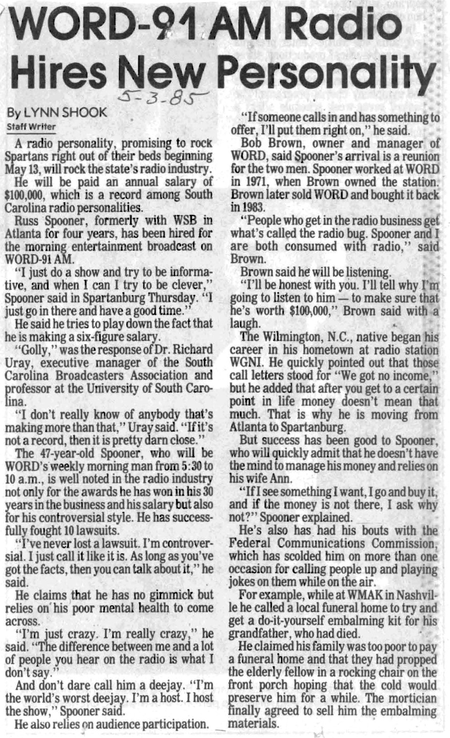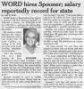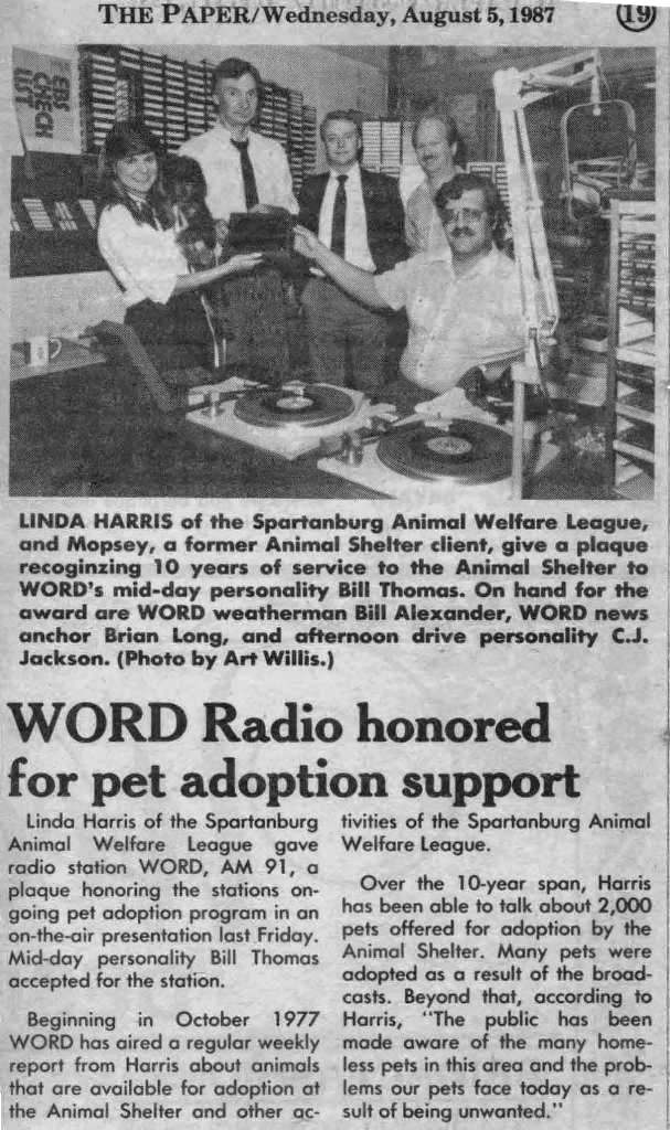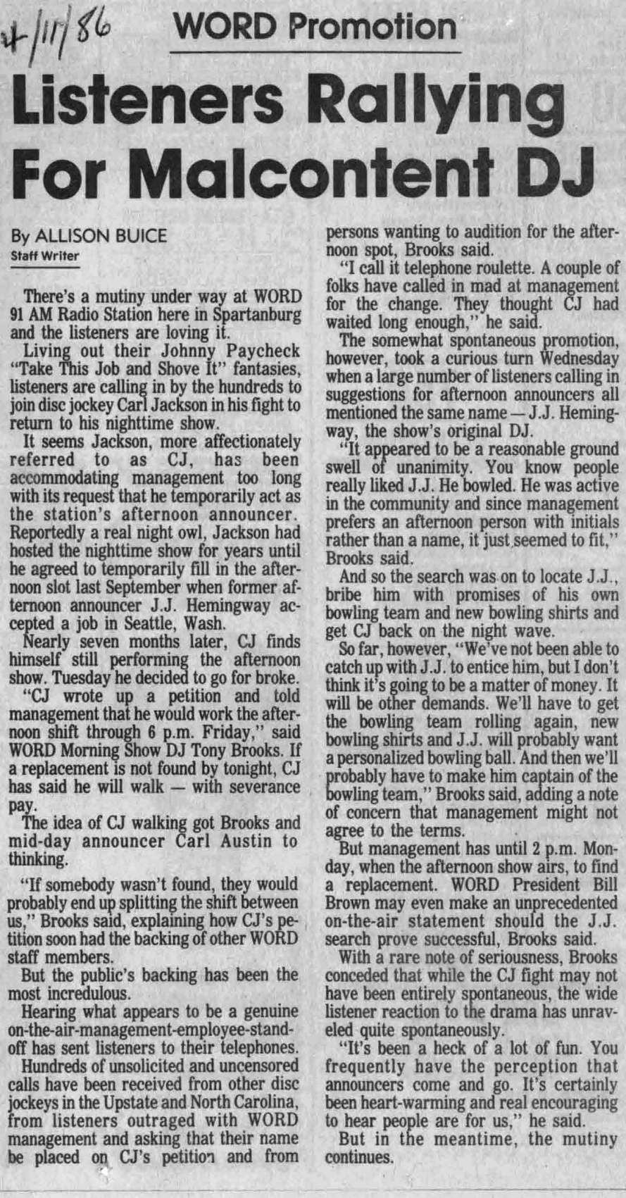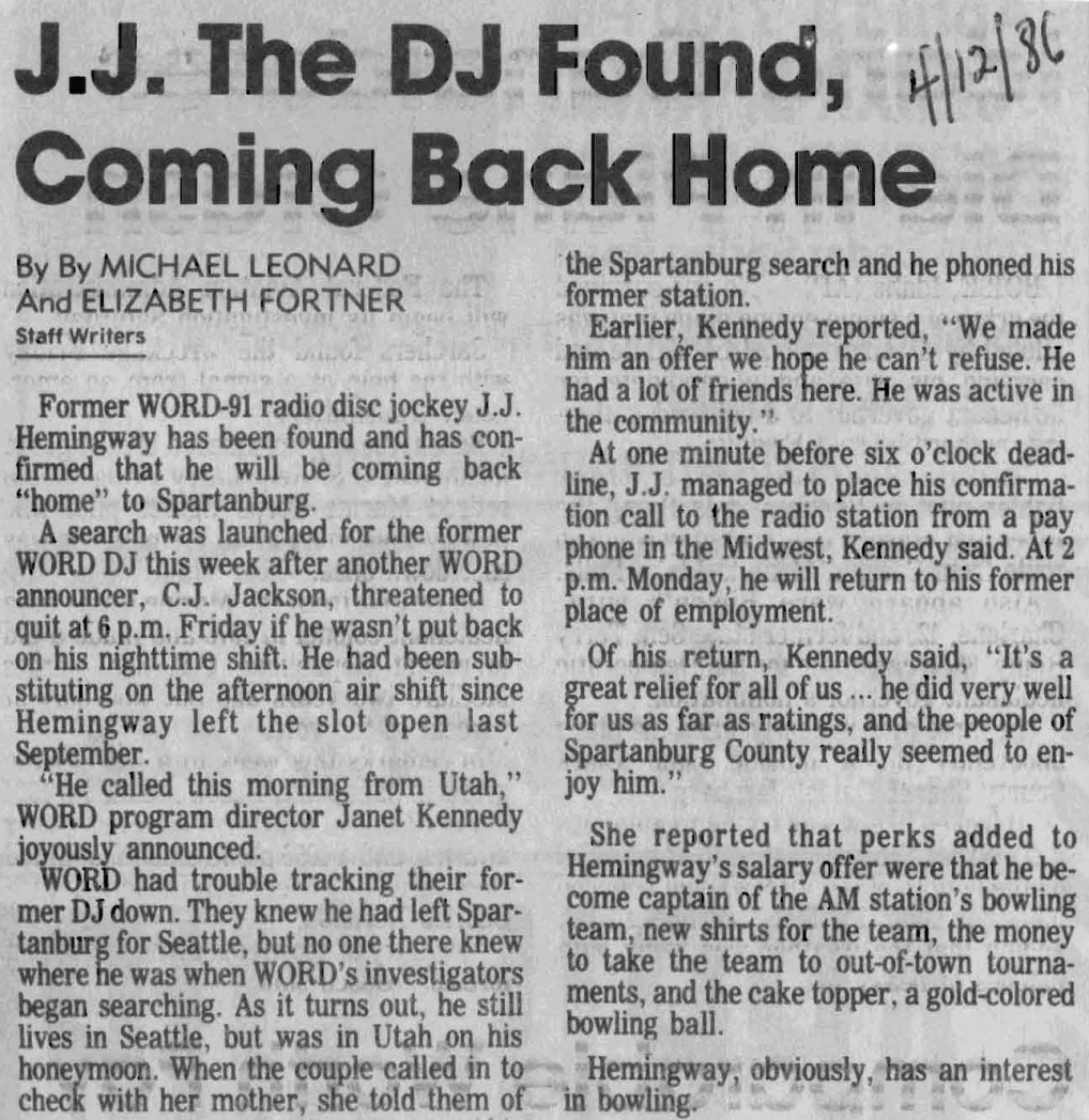 I was going through old papers in the garage this afternoon in the Atlanta 'burbs, looking to see what I could throw away / clean up / etc / et al. You know the drill on such things if you've ever kept way too many things over the years. I ran across an envelope or two of clippings my late mom had apparently cut out of the local Spartanburg, SC newspaper of mostly news items regarding where I worked at the time, WORD radio. All were from the mid and late 1980's. WORD was one of the more well-known medium market "top 40" stations for quite a long period of time, and I was fortunate to have grown up listening to it and subsequently worked there twice. I apparently did ok (smile), winning a market-wide "Who is your favorite dj?" thing one of the upstate newspapers did one year. Kinda floored me, didn't expect it. There are so many newspaper clippings! I'll scan more of these in and post them as I get time or am bored at night. I remember in the naiveness of my teens and twenties I thought I would always work there... it was too much fun, even when it wasn't, when Bob Brown would stalk the hallway in his black suit looking for someone to fire. Actually Bob taught me the finer points of single malt scotch across I-85 at the bar at the hotel the occasional night when he would hold court with whomever wanted to come over. Yes his mom DID have blue hair.